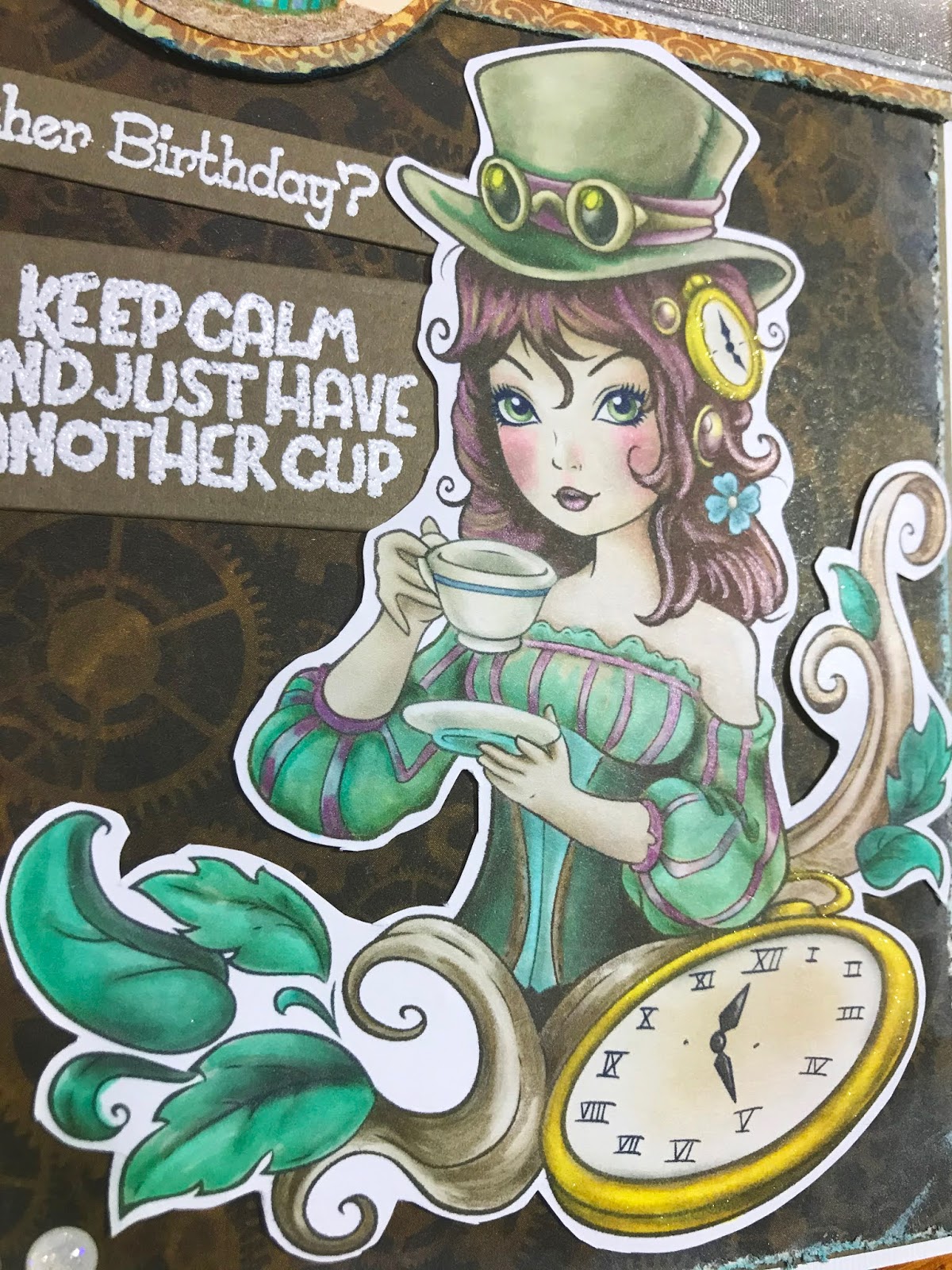 Here's the image we were graciously given to use for this challenge: It's Tea Time! It has a really nice Steampunk/British vibe but as I needed a birthday card for a gorgeous 62-yr-old friend who still loves to party and have adventures, I needed something a little stronger in that cup so my card has no Tea vibe. I'm not sure she knows about Steampunk but she'll ask if she doesn't.