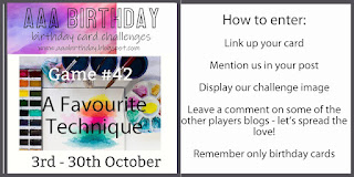 Wonderful card! Cute image and I love the background too. Thanks for playing at AAA Birthday, hope to see you join in with future challenges too. Stay safe and keep crafting!